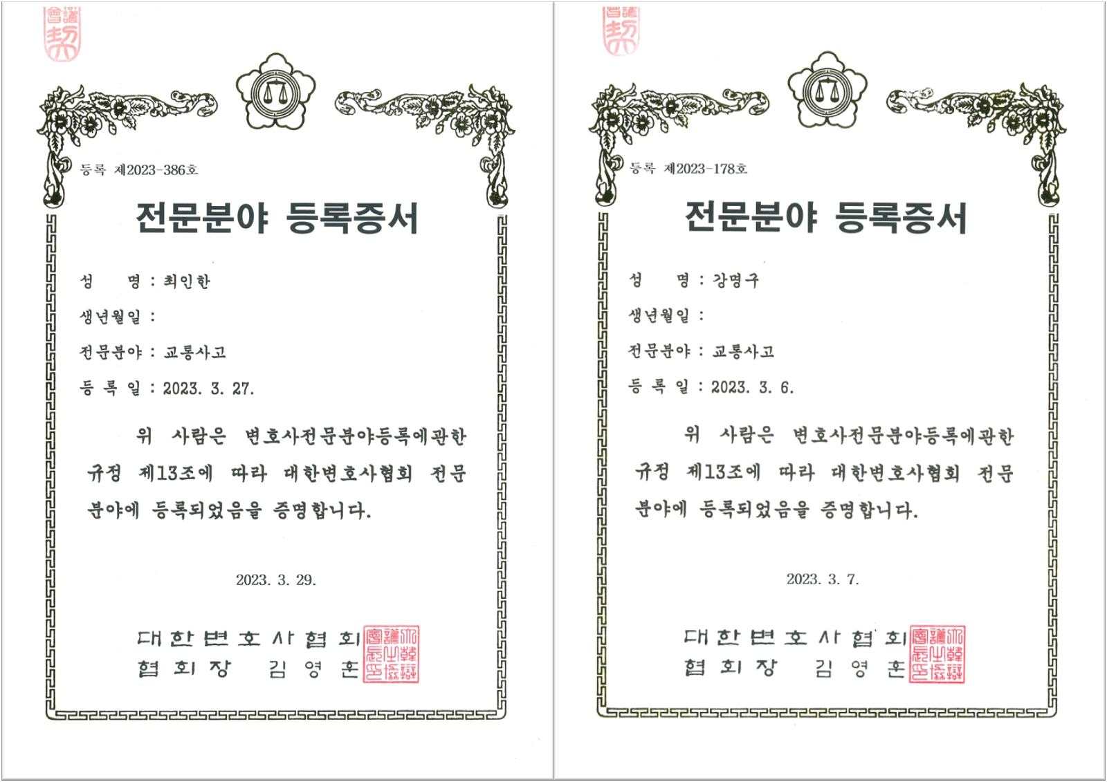 대한민국에는 수 만 명의 변호사가 있습니다. 하지만 그 중에서도 대한변호사협회에서 정식으로 교통사고 전문 변호사로 등록되어 있는 변호사는 그 수가 많지 않습니다. 교통사고 전문 변호사로 등록되기 위해서는 최소 3년 이상의 경력과 일정 수 이상의 사건 수임 실적이 필요하며, 협회 심사를 거쳐야만 ‘전문’이라는 명칭을 사용할 수 있습니다. 따라서 ‘서울교통사고전문변호사’는 단순한 홍보 문구가 아닌, 실제로 실무와 경험을 통하여 만들어진 자격입니다.
