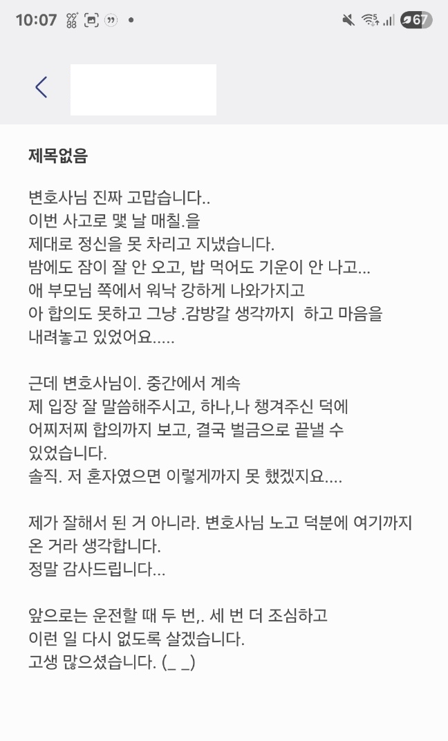 법률사무소 희도는 사건 초기 피해 아동의 부모님 측에서 워낙 태도가 완강하여 합의가 쉽지 않았습니다. 그러나 변호인이 직접 나서 지속적이고 진심 어린 사과와 설득을 진행한 끝에 극적으로 합의에 도달할 수 있었습니다.