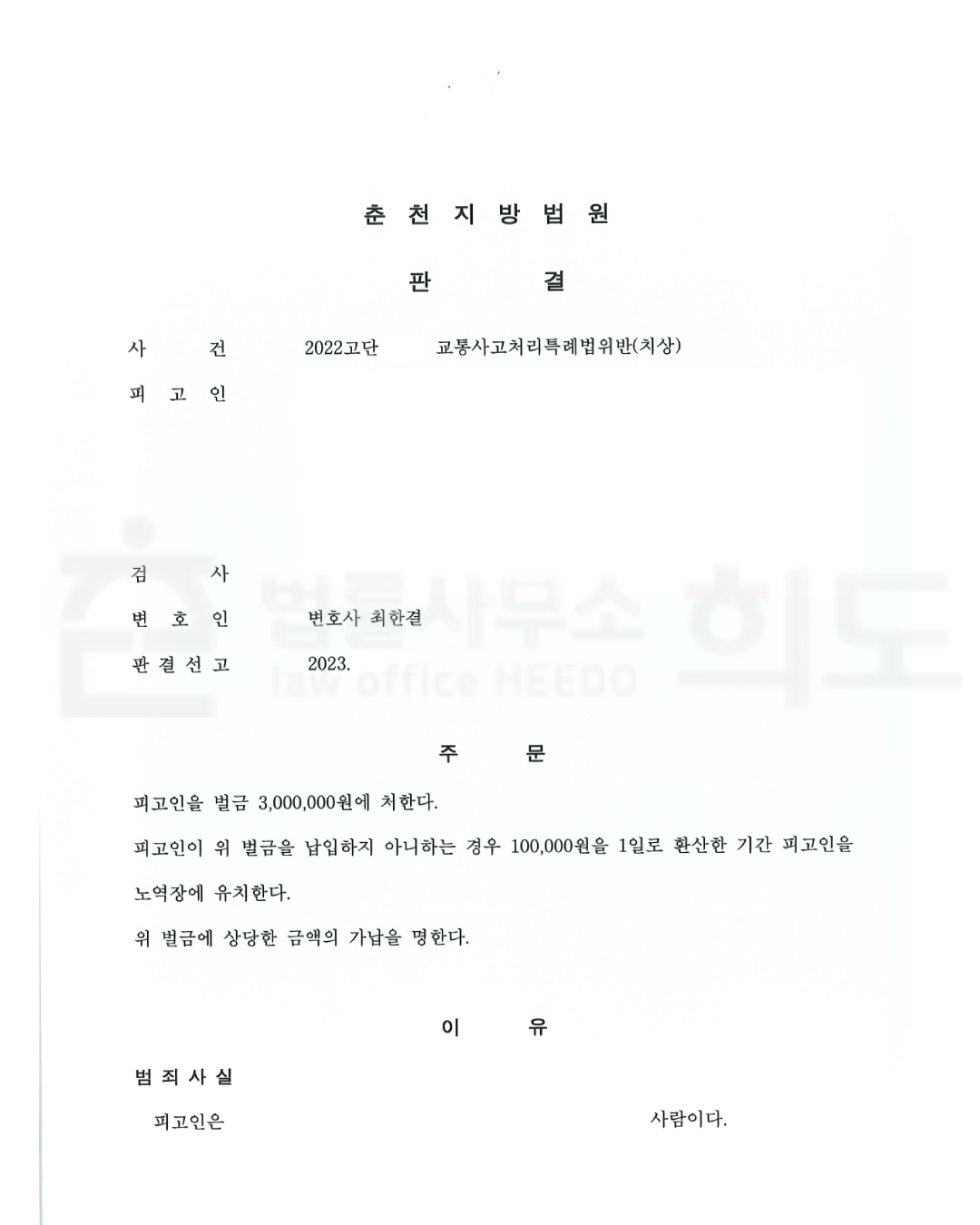 변호인은 사건의 경위를 면밀히 분석한 후, 의뢰인이 사고 발생 직후 곧바로 구호 조치를 취하며 피해자에게 진심 어린 사과를 한 점, 피해자와 원만히 합의가 이루어진 점, 의뢰인에게 그동안 어떠한 전과도 없던 점을 적극적으로 피력하였습니다. 또한 의뢰인이 이미 종합보험에 가입되어 있어 피해 회복에 실질적인 도움이 된 점 역시 강조하였습니다. 이러한 정상 참작 사유가 종합적으로 고려된 결과, 재판부는 의뢰인에게 실형이 아닌 벌금형을 선고하였습니다. 결국 의뢰인은 교통사고처리특례법상 중과실 사고임에도 불구하고 변호인의 적극적인 조력으로 구속을 면하고 사회생활을 이어갈 수 있게 되었습니다.